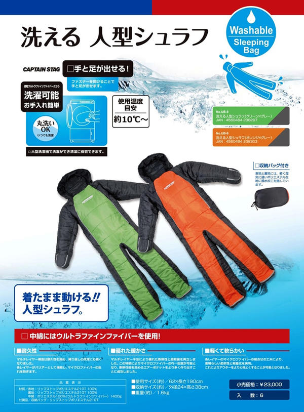 洗える人型シュラフ(寝袋) UB-0008/UB-0009 グリーンxグレー/オレンジxグレー 【条件付送料無料】 キャプテンスタッグ/アウトドア用品・キャンプ用品/UB-8/UB-9 ※UB-9 オレンジ×グレーは廃番