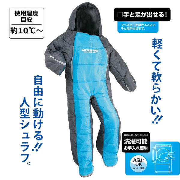 アウトドア シュラフ 防災 家 動ける【キャプテンスタッグ 洗える人型シュラフ(寝袋)140ジュニア(ブルーxグレー)】
